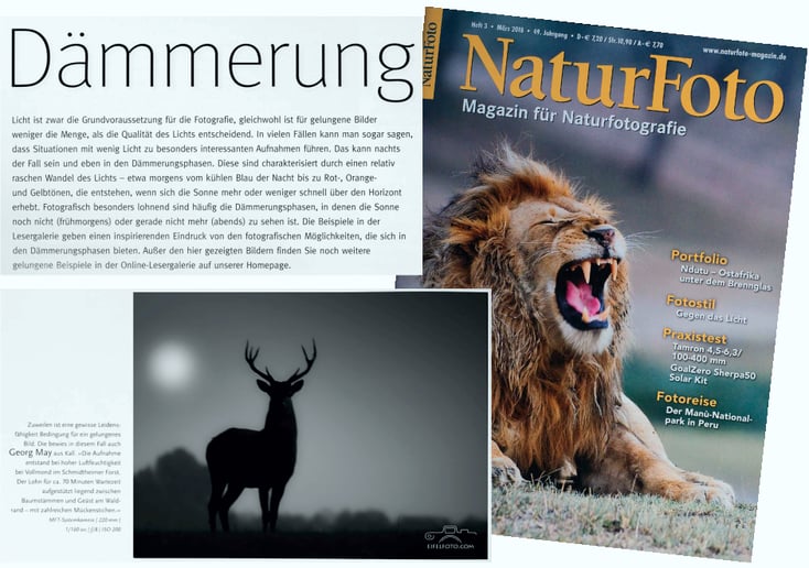 Herzlichen Dank an die Redaktion der Tecklenborg Verlag GmbH Schweinfurt für die Auswahl meines Fotos bei den besten Leserfotos zum Thema Dämmerung und die Veröffentlichung meines Fotos im Heft 03/2018.